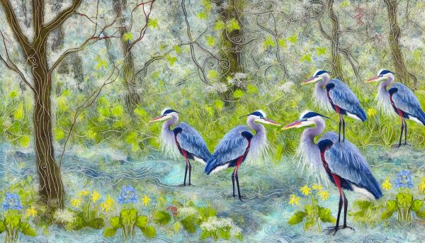 Title: Enchanting Great Blue Herons Amidst Spring's Blooming Forest Photo ID: 44029