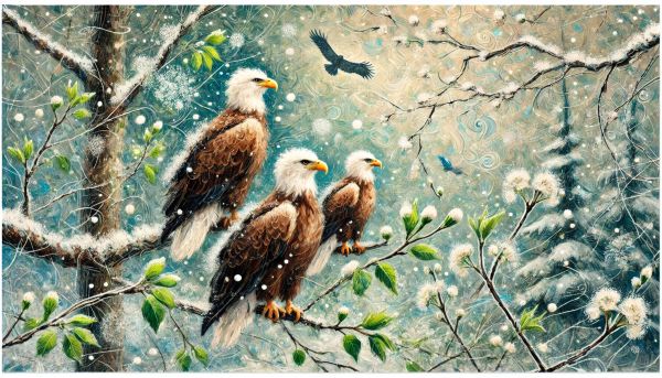 Title: Majestic Bald Eagles Amidst Snow-Dusted Blossoms and Swirling Winds