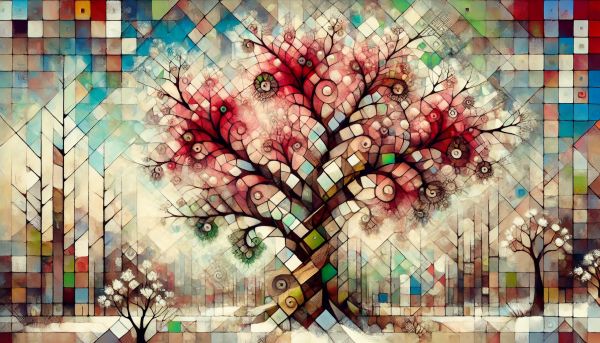 Title: A Stylized Winter Symphony: Cubist Interpretation of a Red Maple