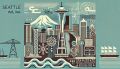 Whimsical Artistic Rendering of Seattle's Skyline and Iconic Landmarks