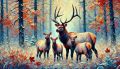 Whimsical Family of Roosevelt Elk in Autumnal Forest Dreamscape
