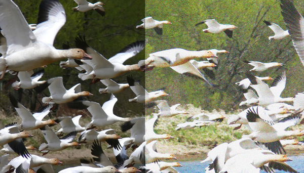 Left side with Low (darker + not noticeable noise) ISO value, and right side with high (brighter + more noise) ISO value.